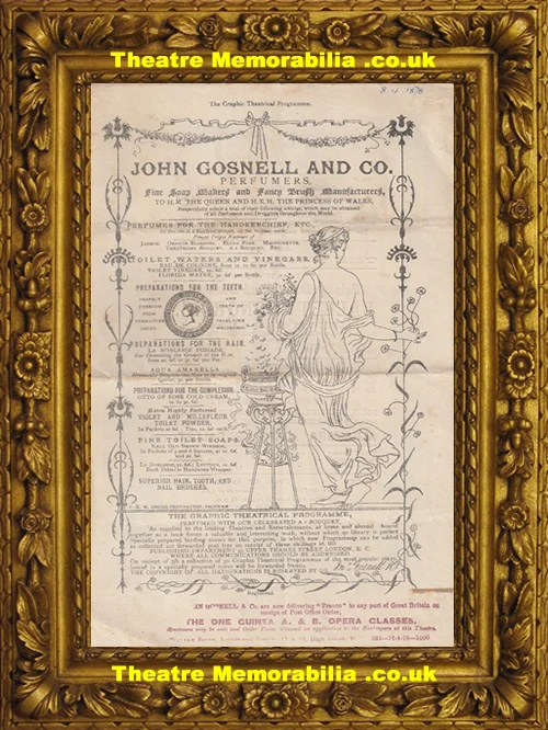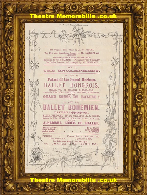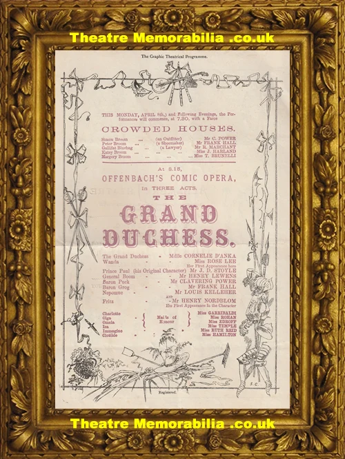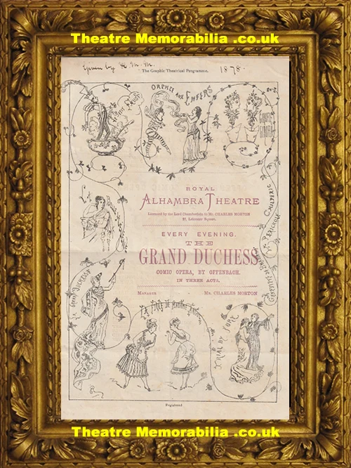 Programme for a revival at the Royal Alhambra Theatre in London of the Offenbach comic opera “The Grand Duchess”. The limited run had commenced on 1 April 1878 – this programme was printed on 16th April. Lead roles were taken by Cornelie d’Anka, Henry Nordblom, Rose Lee and JD Stoyle. The decorative four-page programme was published by The Graphic and has images on the cover of scenes from other musical pieces by Offenbach and other composers, including the Judge and Plaintiff in the Gilbert & Sullivan “Trial by Jury”.